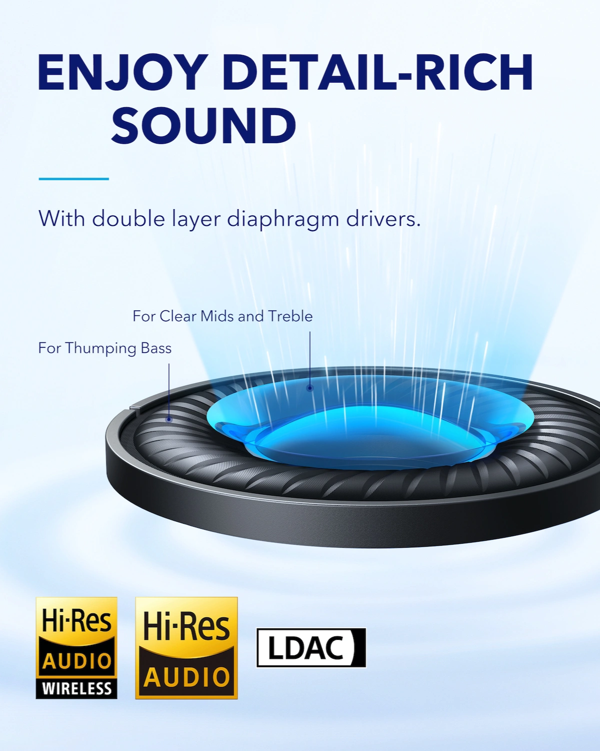 Hear Every Detail: The 40mm drivers have a pioneering double-layer diaphragm made from silk and ceramic materials to produce sound with intense bass and crisp treble. Space Q45 noise canceling headphones also support LDAC for Hi-Res Audio Wireless sound.